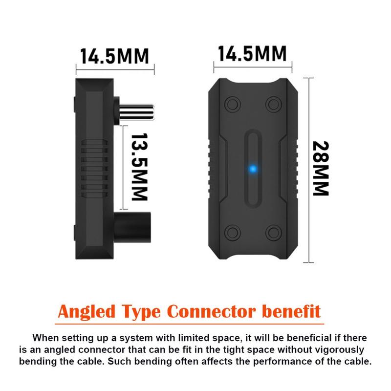 The angled type allows you to connect it to a female port, even if space around the port is limited