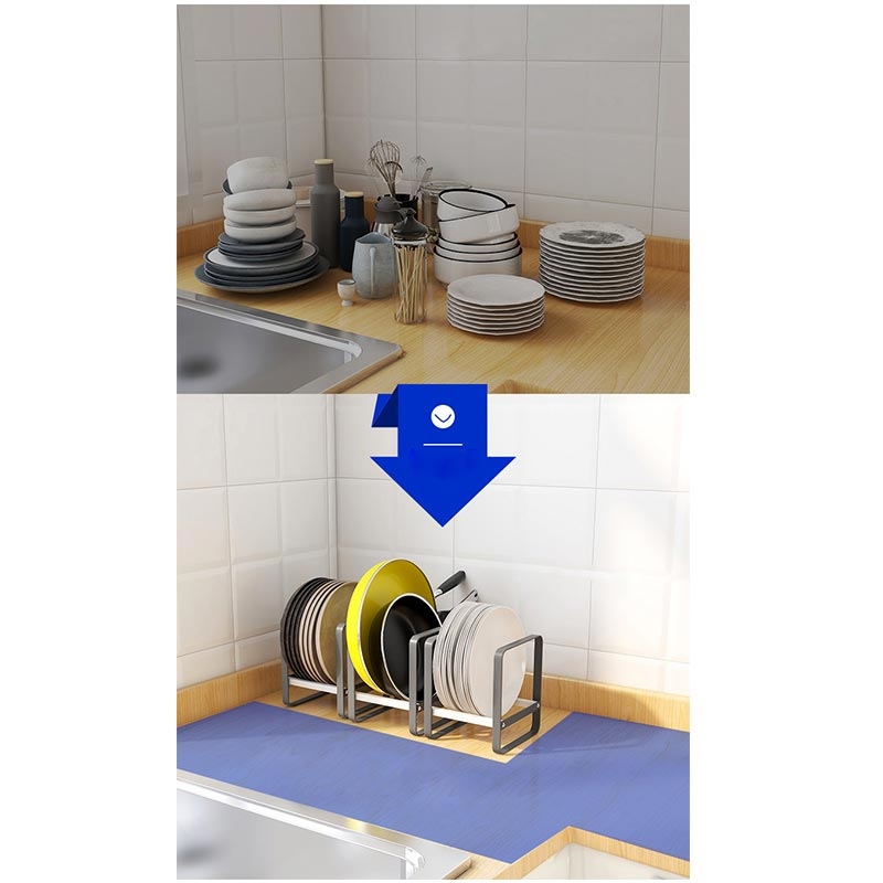 The compact yet functional layout maximizes countertop space while keeping plates, bowls and lids neatly arranged.