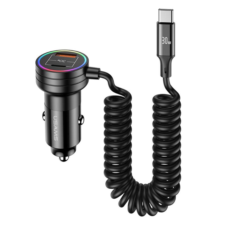 Usams US-CC167 Car Charger 60W With USB-C, USB-A Ports and USB-C Cable - Ambient Light, Power Delivery
