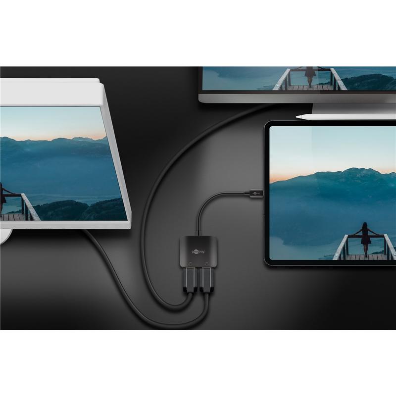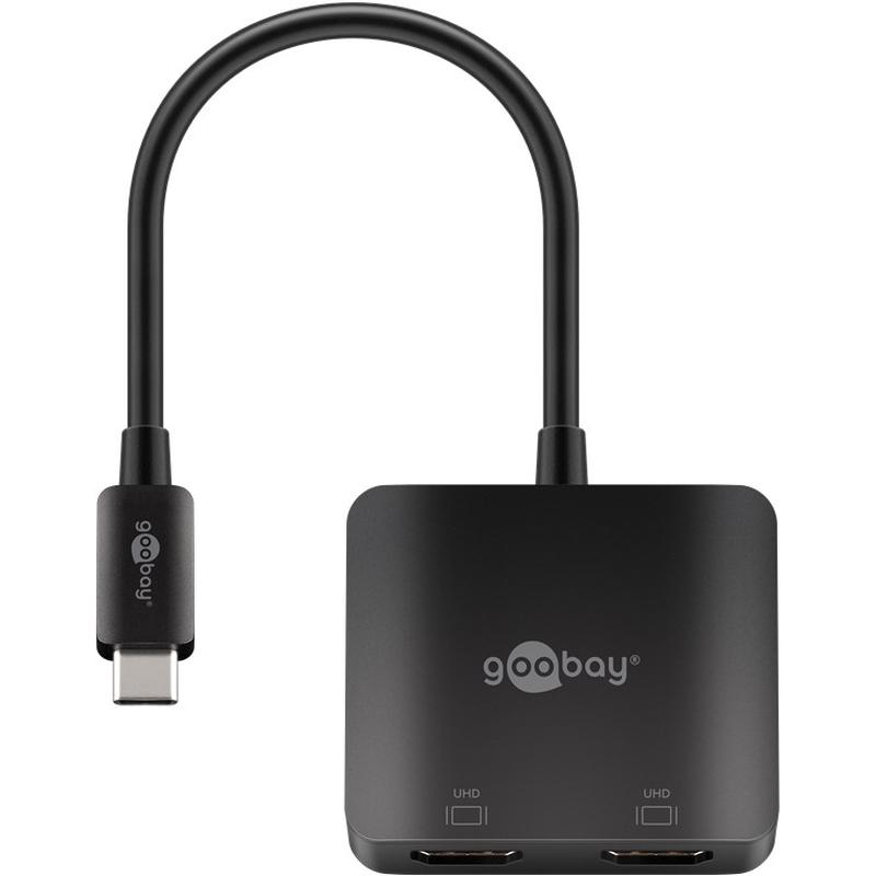 Adapter för flera monitorer för att spegla data, ljud- och videosignaler från USB-C™ till upp till 2 HDMI™-portar, Möjliggör t.ex. synkronisering av upp till 2 skärmar samtidigt via HDMI™, Lämplig för värddatorer med USB-C™-kontakt, Navet stöder maximala skärmupplösningar på 2x 4K @ 60 Hz i MST-läge under Windows, I SST-läge (Single Stream Transport) macOS stöder upp till 2 x 4K @ 60 Hz, Tack vare Plug & Play kan splittern användas utan att installera drivrutiner. Stödjer HDR (High Dynamic Range) för bilder med hög kontrast samt HDCP 1.4 och 2.2 för skyddad signalöverföring
