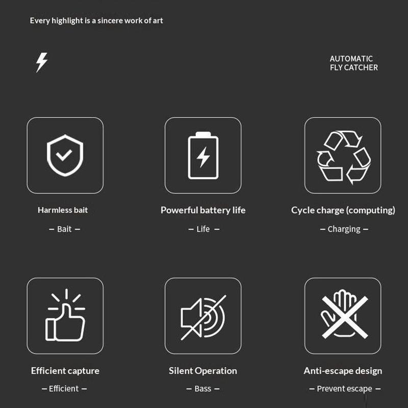 Keep indoor spaces more comfortable and hygienic with this USB rechargeable automatic rotating fly trap. Designed for quiet and practical everyday use, this household fly catcher uses a physical trapping method with rotating suction technology to help capture flying insects without relying on strong odours or more complicated setups. It is a useful solution for kitchens, dining areas, caf s, food preparation spaces, and other indoor environments where flies can be a nuisance.