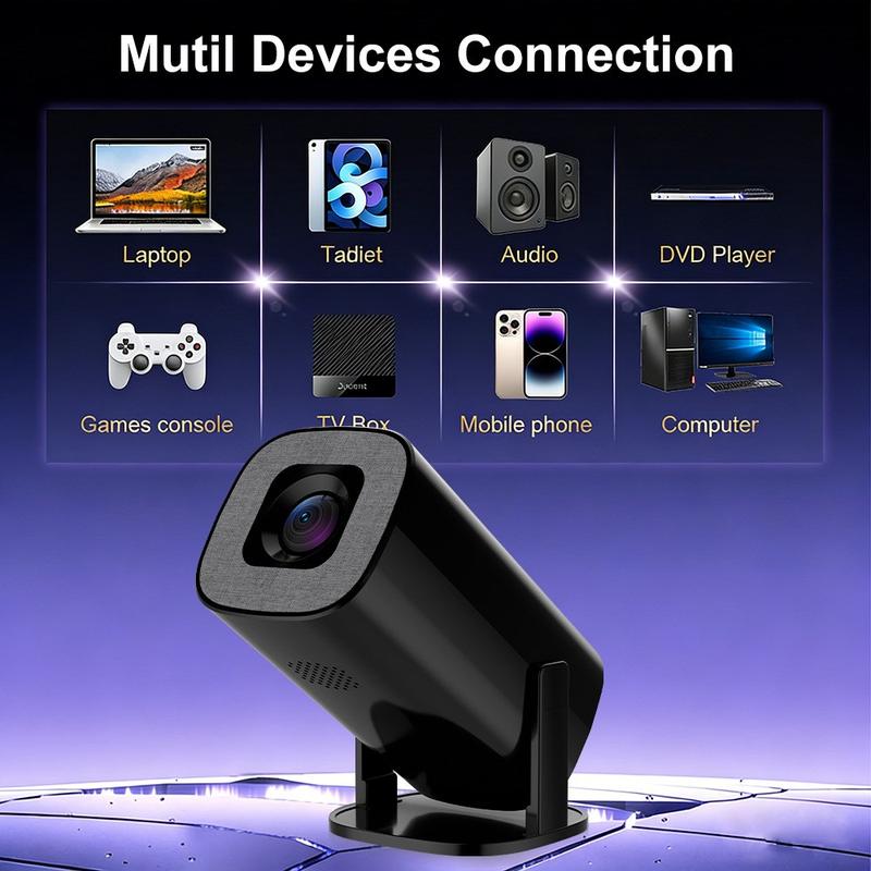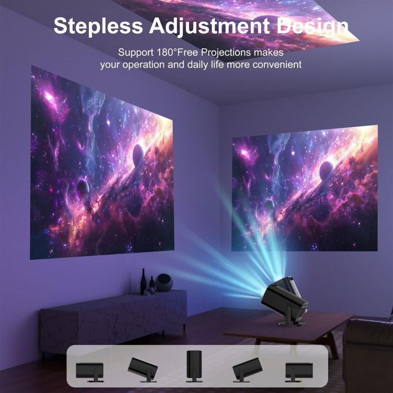 Bring big-screen entertainment anywhere with the V1 smart video projector-an ultra-compact home theater projector powered by Android 14. Stream apps directly on the projector, mirror your phone wirelessly, or plug in a console via HD input for movie nights, casual gaming, and presentations. The 200 ANSI brightness is ideal for dim rooms and evening viewing, while the 180 adjustable projection angle makes it easy to project onto a wall or even the ceiling from a bedside table.