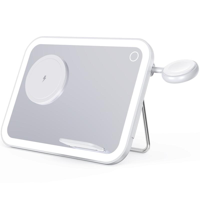 The V22 3-in-1 Wireless Charger combines a MagSafe-compatible charger, an LED makeup mirror, and a night light in one elegant device. This versatile gadget is designed to provide convenience and functionality in your daily routine.