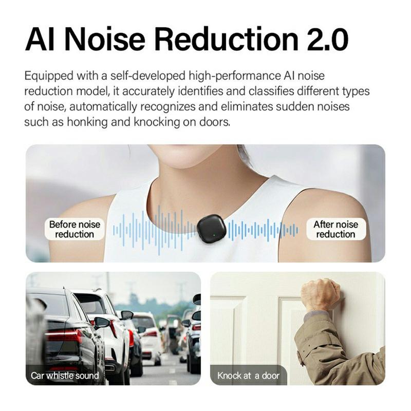 The V36 Mini Wireless Lavalier Microphone uses advanced AI-driven noise cancellation with three modes: High-Fidelity (green light), AI Noise Reduction (default, yellow light), and DSP Noise Reduction. This ensures your recordings are free from unwanted background sounds while keeping your voice natural and clear – perfect for vlogs, interviews, live streams, and podcasts.