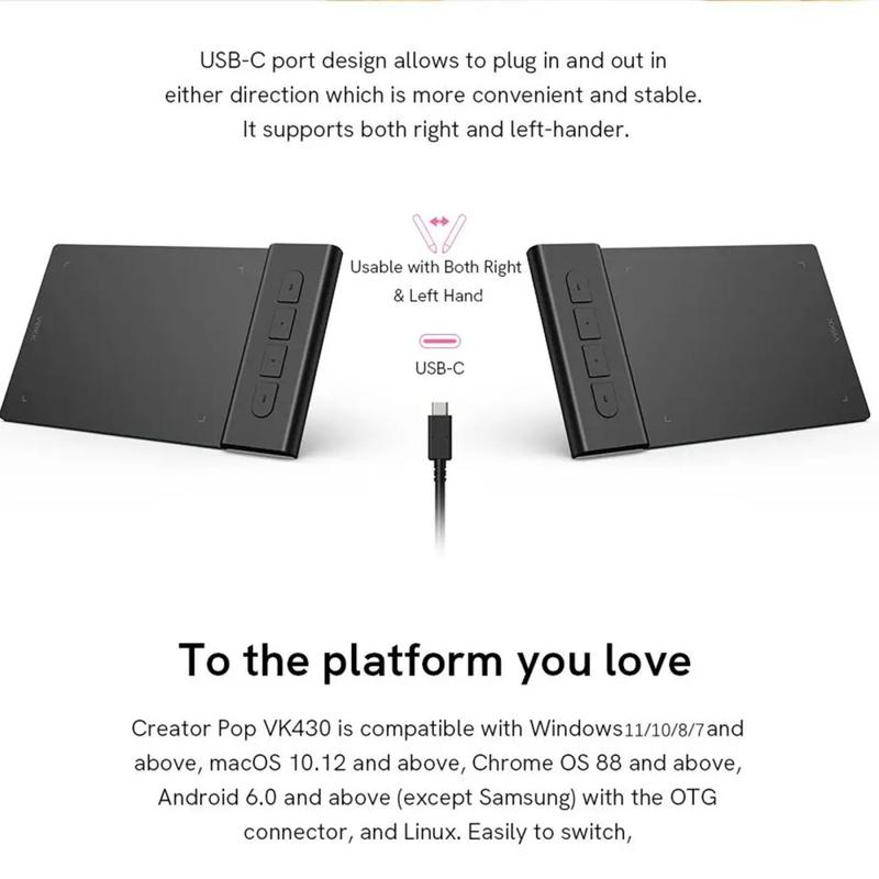 Ergonomically designed for efficiency, the Creator Pop VK430 comes equipped with four customizable shortcut keys, allowing you to switch between different programs or favorite shortcuts with ease, such as undo or zoom in/out. The USB-C port design enables plug-and-play in any orientation, ensuring convenience and stability while supporting both right-handed and left-handed users