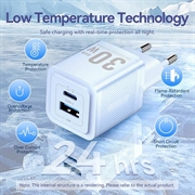- Dual-port output: USB-C (30 W PPS / PD 3.0) and USB-A (30 W QC 4.0 / QC 3.0) for phones, tablets and earbuds