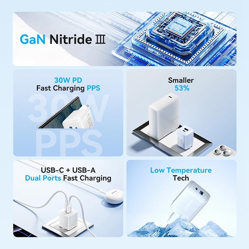 Vention FEQ 30W GaN Fast Wall Charger - Dual USB-C and USB-A