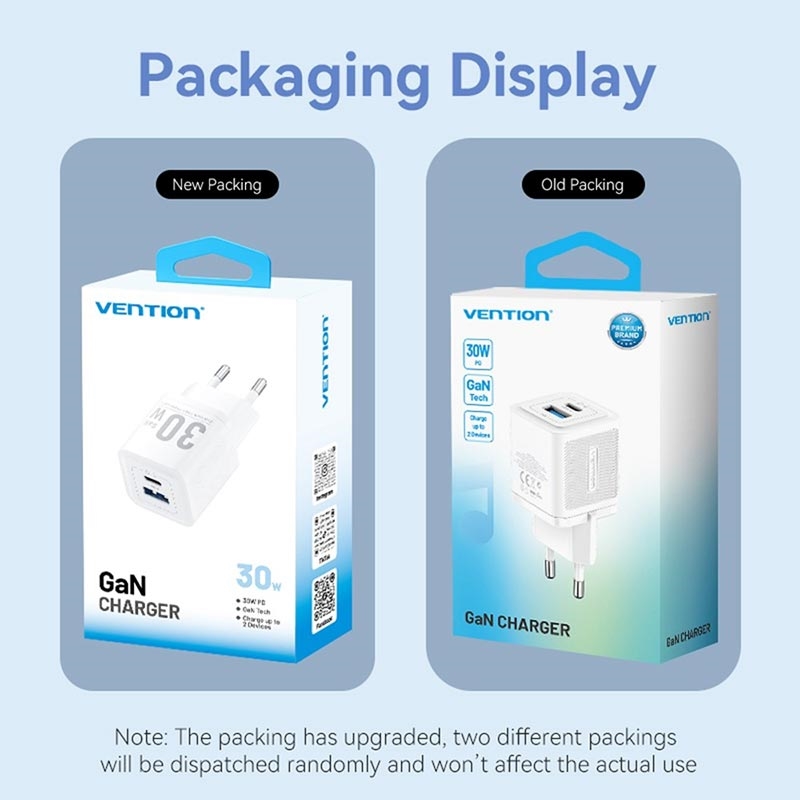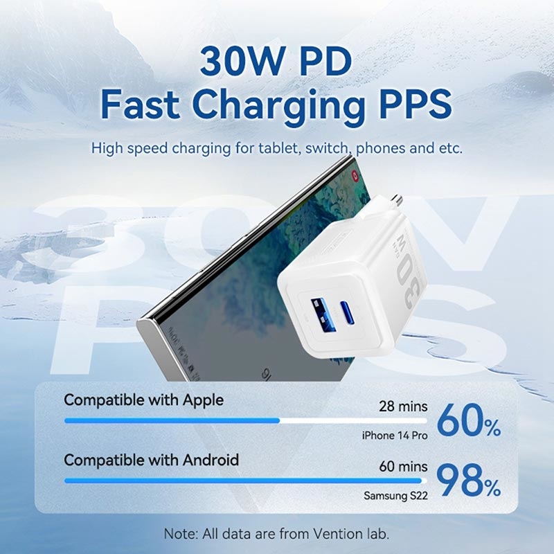 Charge phones, tablets and earbuds at top speed with one pocket-size plug. The VENTION FEQ GaN charger uses next-gen gallium nitride components to deliver a full 30 W through either its USB-C or USB-A port, while staying cooler and smaller than old-style silicon bricks. Multi-protocol support means fast, safe power for everything from iPhone and Galaxy handsets to Nintendo Switch and Bluetooth speakers, at home or on the road.