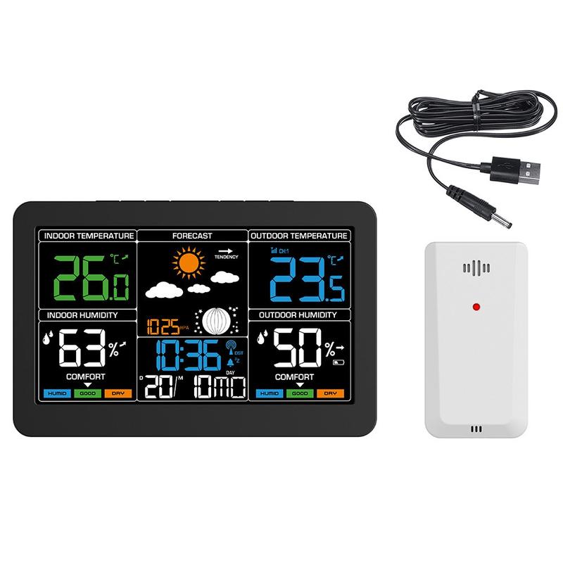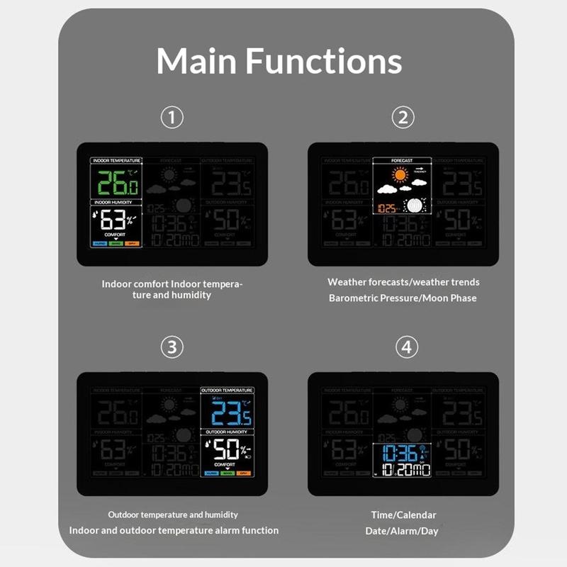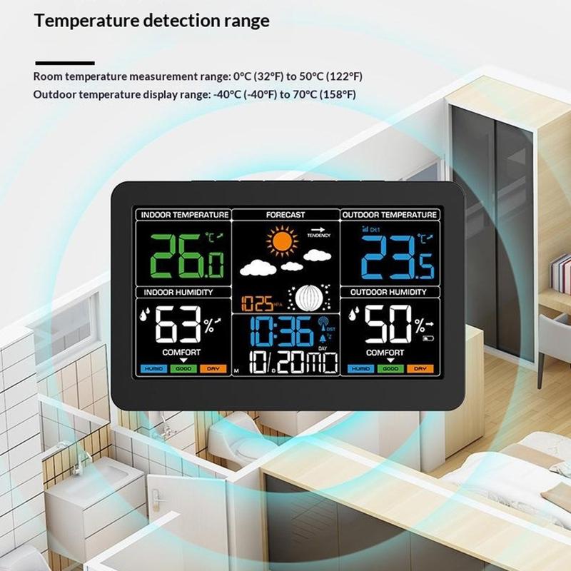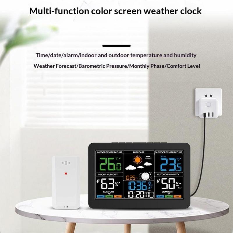 This wireless weather station combines time, date, alarm, indoor and outdoor temperature, humidity monitoring, weather forecast, barometric pressure, moon phase, and comfort level display in one practical device. With its large colour screen and easy-to-read layout, it is a useful addition to a bedroom, kitchen, office, or living room. It helps you check important daily information at a glance while keeping your space more organised.