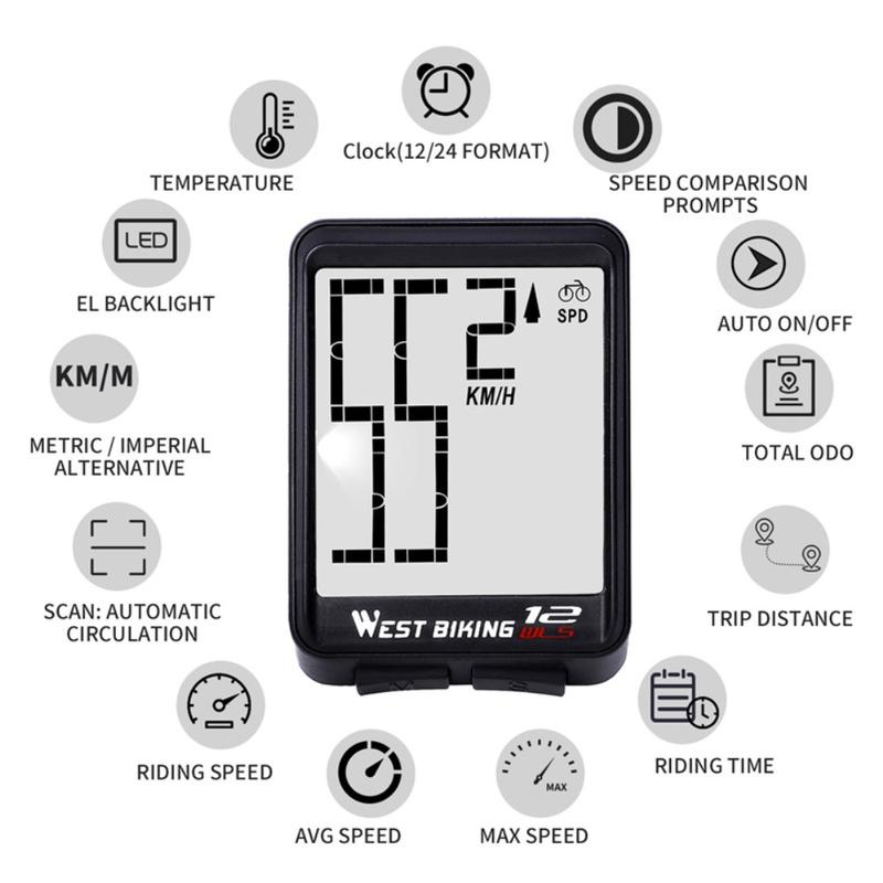 WEST BIKING MTB Road Bike Computer Screen Backlight Waterproof Wireless Multi-function Cycling Speedometer - Black