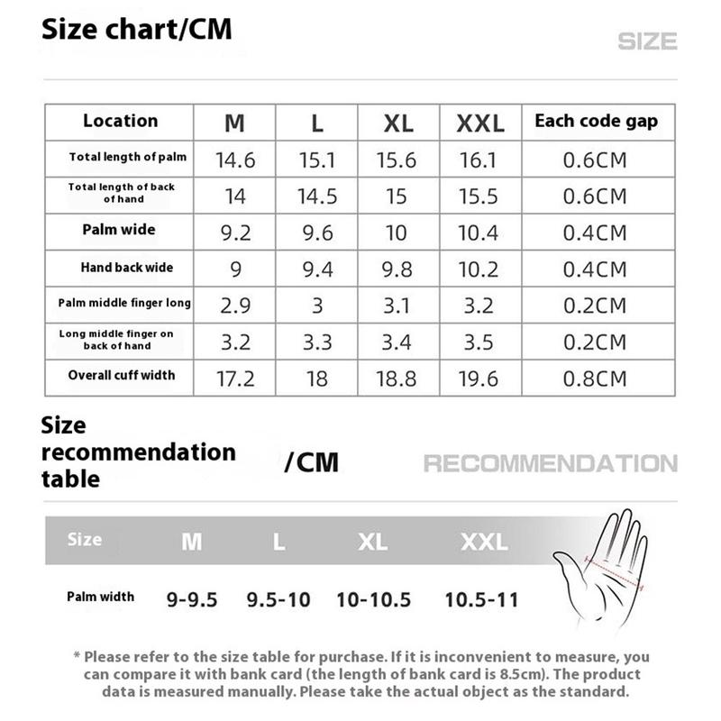 - Size M: Palm width: 9,2cm; Total length of palm: 14,6cm