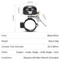 Equipped with an adjustable aluminum alloy clamp, the bell fits handlebars with diameters of 22.2-28 mm. A protective silicone pad prevents scratches, ensuring a secure, stable, and damage-free installation.