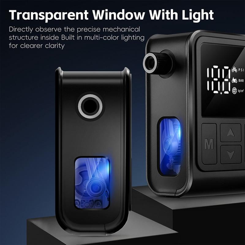 Portable electric pumps like this one use a compact motorized piston system to generate high air pressure in a small form factor. The digital display and automatic shut-off features are inspired by professional garage compressors, offering advanced functionality in a travel-friendly design.