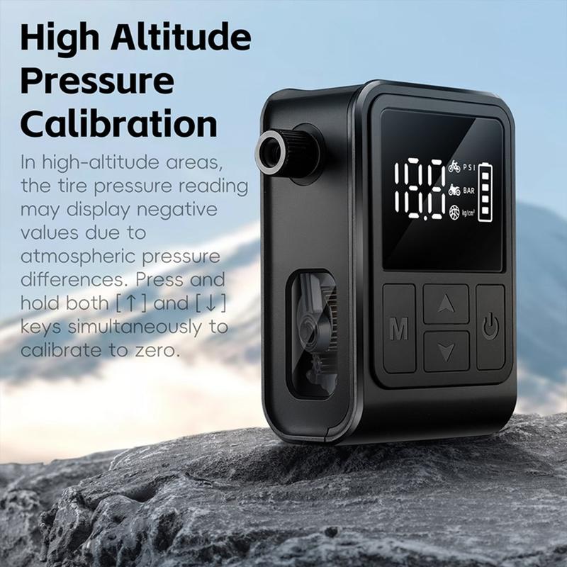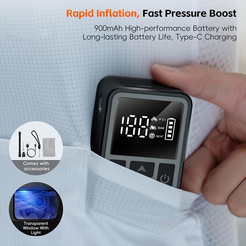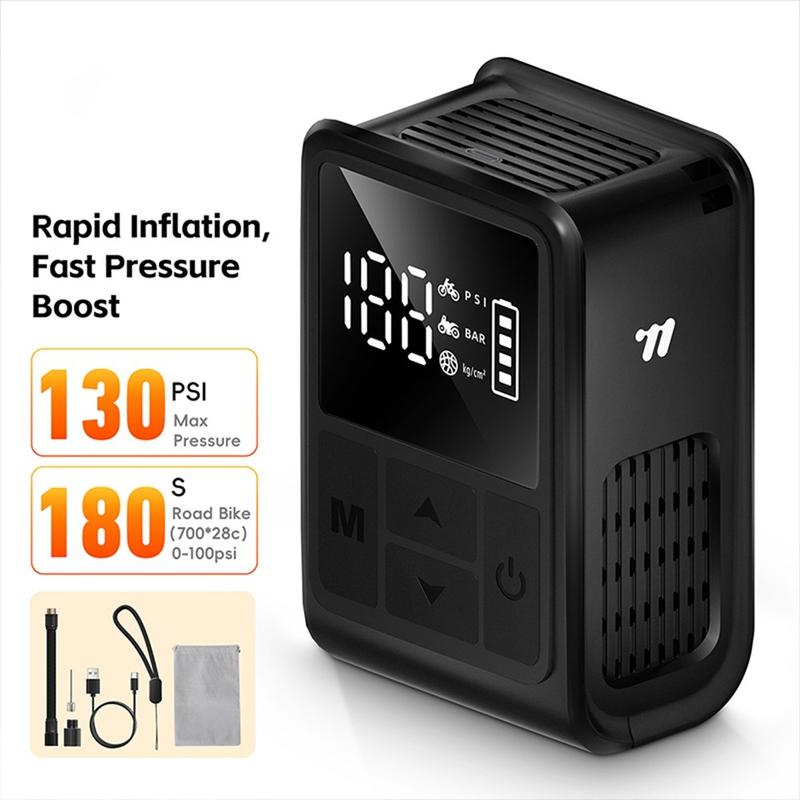 The WEST BIKING YP0711196 High Pressure Electric Bike Pump is a compact and powerful air compressor designed for cyclists, motorcyclists, and everyday users. With a maximum capacity of 130 PSI, this portable pump quickly inflates tires and sports equipment with ease. The built-in digital display provides accurate, real-time pressure readings, while the preset function automatically stops inflation once the desired pressure is reached. Powered by a rechargeable 900mAh battery, this pump offers convenience, reliability, and portability for use at home or on the go.
