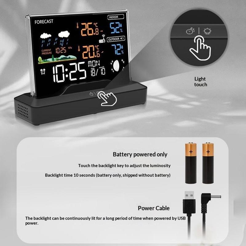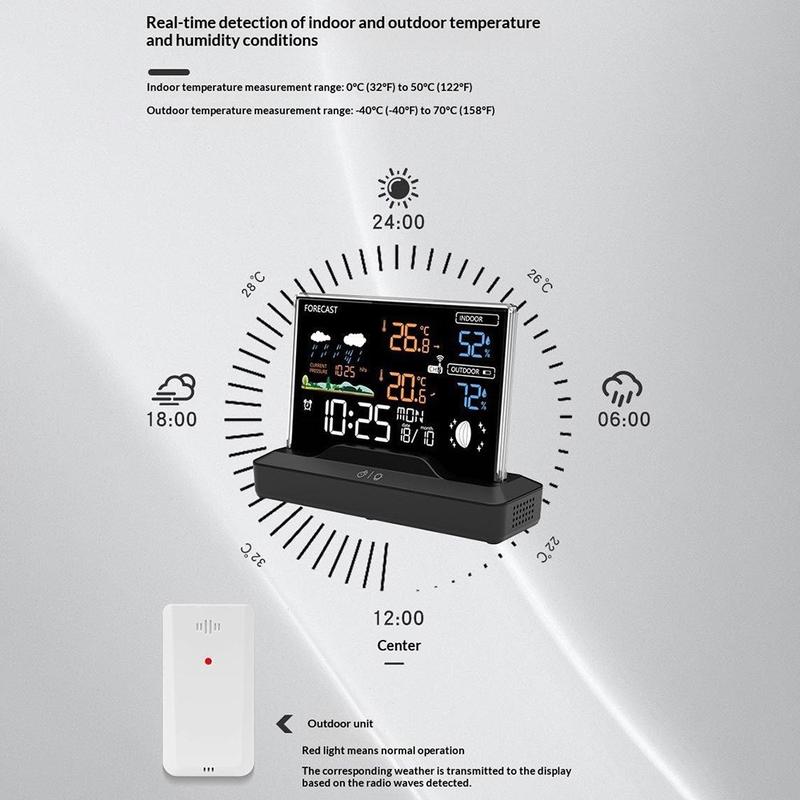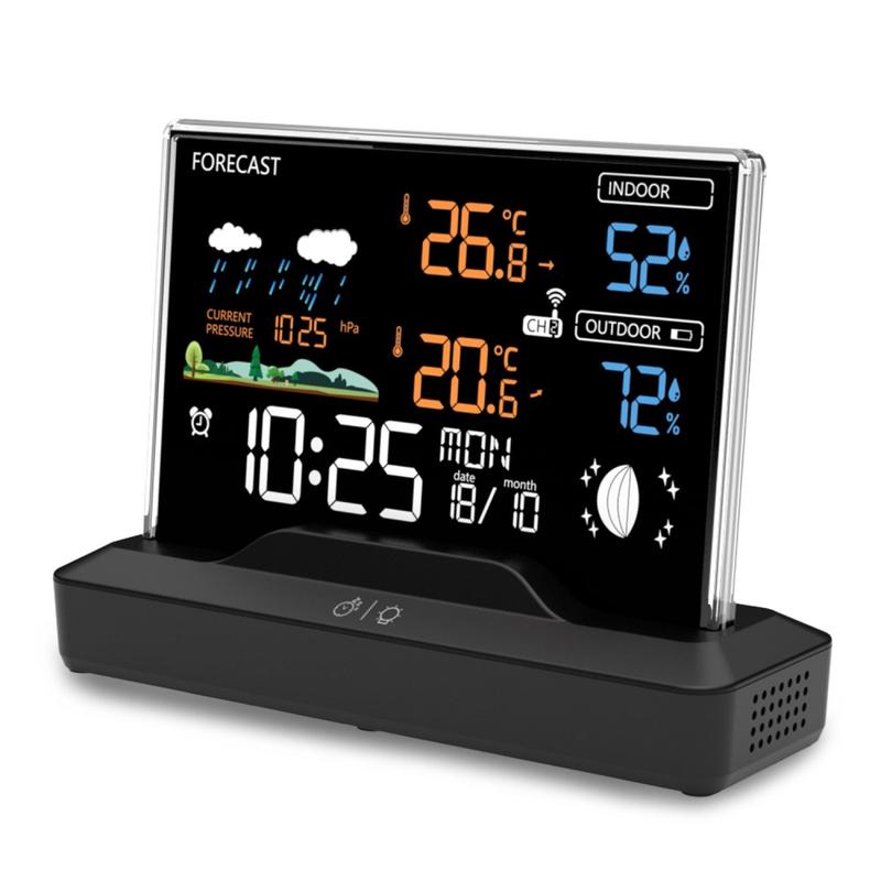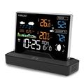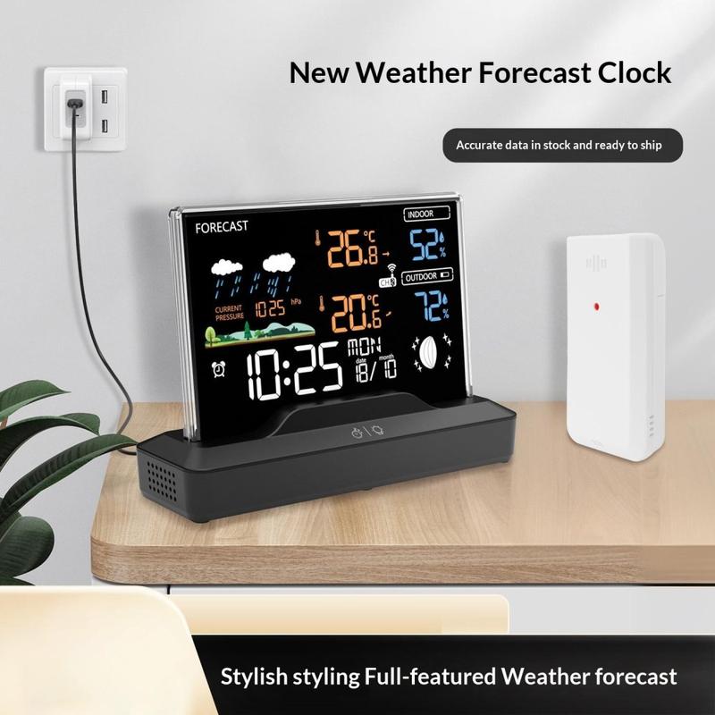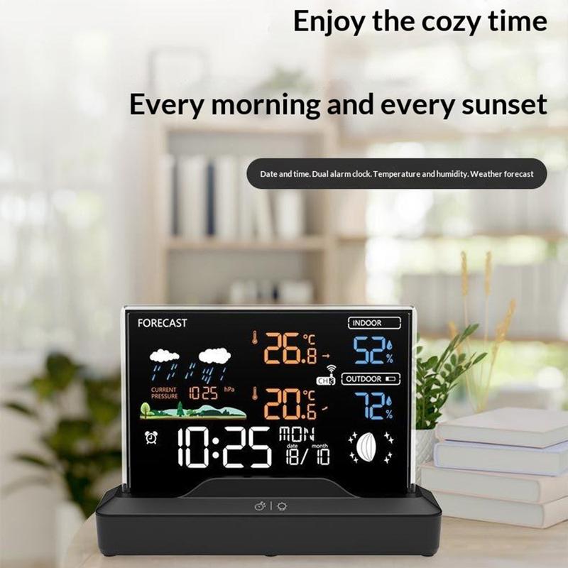 This wireless weather station combines indoor and outdoor temperature tracking, humidity monitoring, weather forecasting, alarm clock functions, and barometric readings in one practical desktop device. Designed for everyday use at home or in the office, it helps you stay updated on room comfort and outdoor conditions at a glance. Its colour LCD display and clear layout make it a useful addition to a bedside table, desk, kitchen counter, or living room shelf.