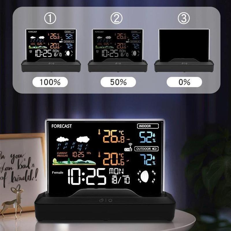 The colour LCD screen shows key information in an easy-to-read format, including temperature, humidity, weather forecast, time, moon phase, and barometric pressure. This makes it simple to check several important details at once without needing separate devices. The backlight helps improve visibility, while USB mode offers 3 brightness settings so you can adjust the display to suit your room and lighting conditions.