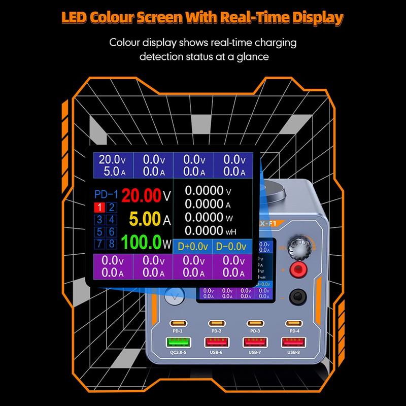 The HD color display provides real-time monitoring of voltage and current with 0.001V / 0.001A precision, ensuring safe, accurate and controlled charging. Its built-in smart chip automatically identifies connected devices and adjusts power delivery for optimal charging performance.