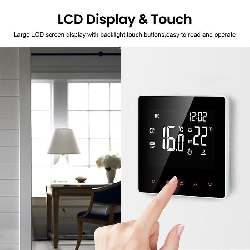 The large LCD touchscreen with backlight is easy to read both day and night. Its elegant one-piece design gives the thermostat a neat and modern look, while the anti-scratch surface helps it stay presentable over time. You can choose between manual mode for direct adjustment and auto mode for programmed heating, depending on your daily routine and personal preferences.