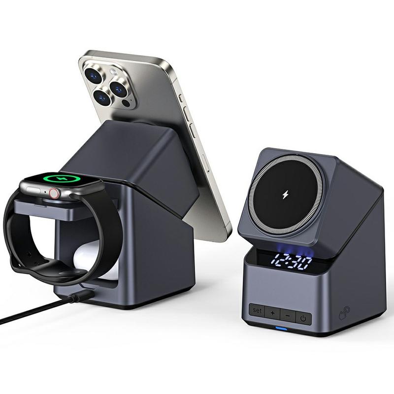 Keep your desk tidy and your essential devices charged with the X11 Qi2 15W 3-in-1 wireless charger stand. This practical charging station is designed for everyday convenience, combining wireless charging for your phone, smartwatch, and earbuds with a built-in LED digital clock in one compact desktop unit.