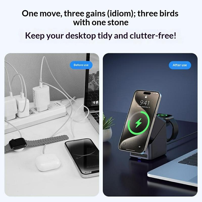 3-in-1 wireless chargers are popular because they replace multiple separate chargers with one organized charging station. Models with magnetic alignment and adjustable viewing angles are especially useful for everyday desk and bedside use.