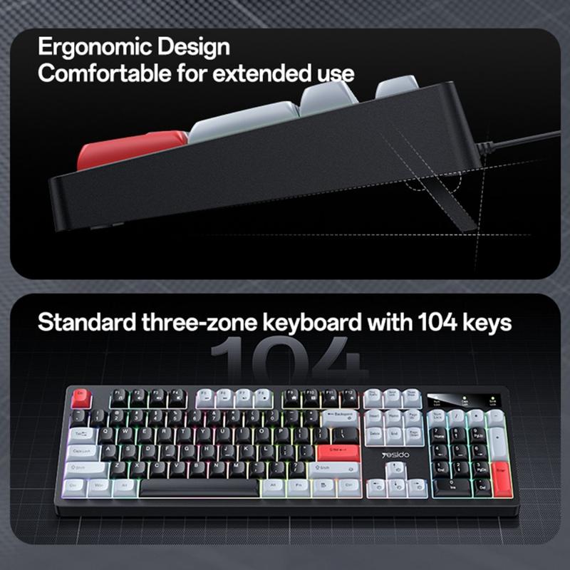 Enhance your typing experience with the YESIDO KB44 wired mechanical keyboard, a stylish and durable full-size keyboard that blends quiet performance with vibrant RGB backlighting. Designed for comfort, longevity, and compatibility, it’s ideal for work, study, and gaming alike.