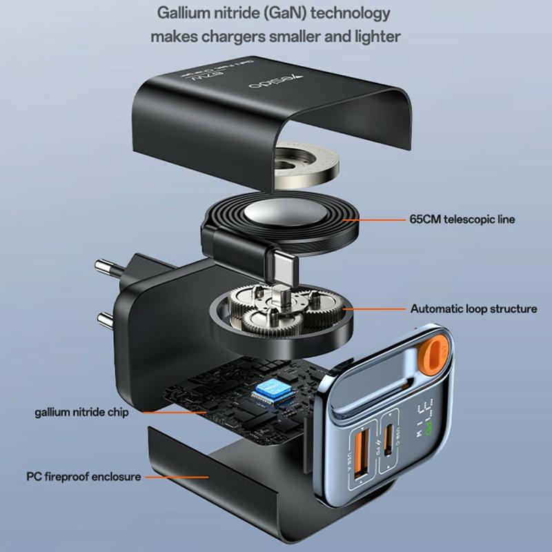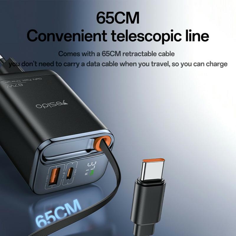 Yesido YC100 67W Fast Charger with Retractable Type-C Cable - USB-A and USB-C GaN Charging Adapter - EU Plug