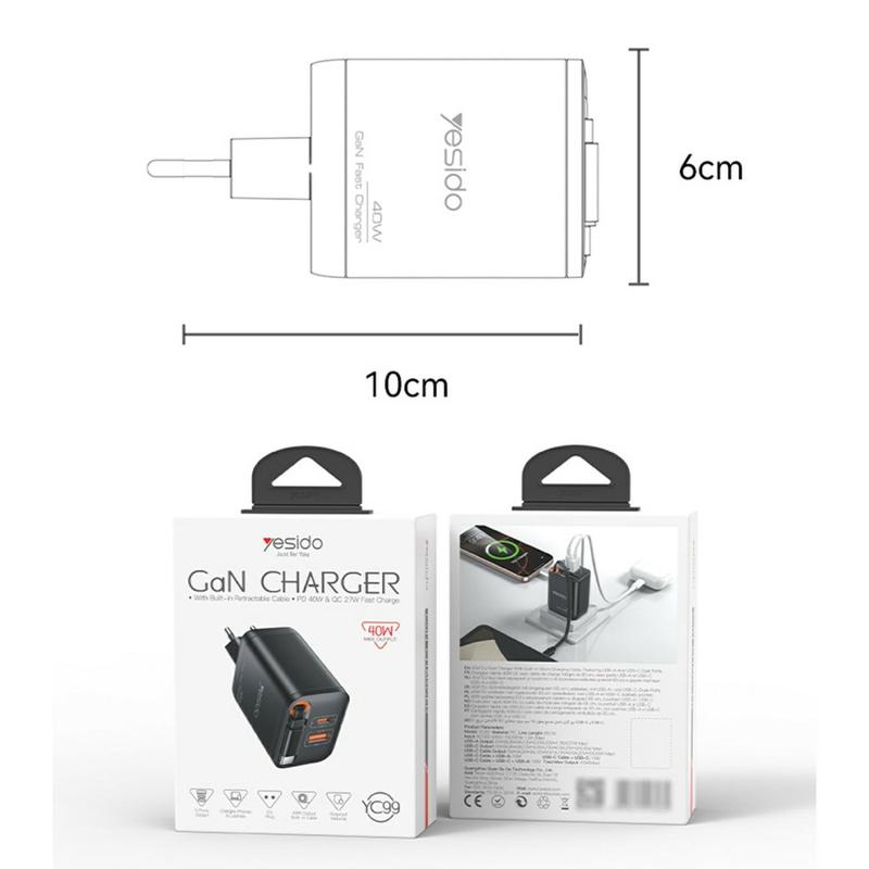 Charge smarter and faster with the YESIDO YC99 40W GaN Fast Charger, a compact and efficient solution designed for modern devices. Equipped with dual ports, advanced Gallium Nitride (GaN) technology, and a built-in retractable cable, it combines power, convenience, and safety — perfect for home, office, or travel use.